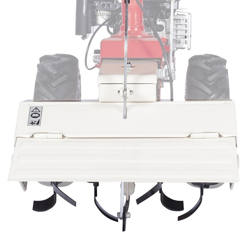 El espolón ajustable y la conexión trasera de 4 estrellas facilitan su operación, mientras que la fresa de 50 x Ø26 cm, equipada con 16 cuchillas de acero en eje horizontal, asegura un trabajo eficiente y preciso en la preparación del suelo.