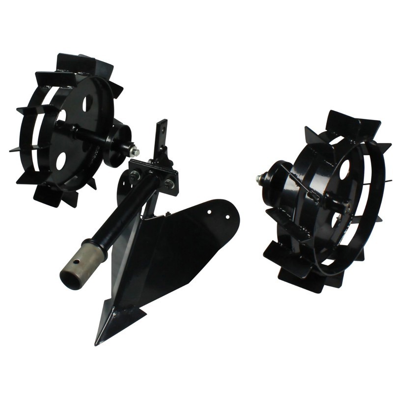 Accesorio de ruedas metálicas y aporcador compatible con la unidad tractora Groover 7A3, cuenta con un ancho de trabajo el aporcador de 30 cm y las ruedas con un diámetro de 42 cm, la distancia entre las ruedas es de 37 cm. Estas incluyen dos alargadores de ejese que aumentan la distancia entre ruedas a 70 cm y tiene un peso en total de 22,5 kg el kit completo
