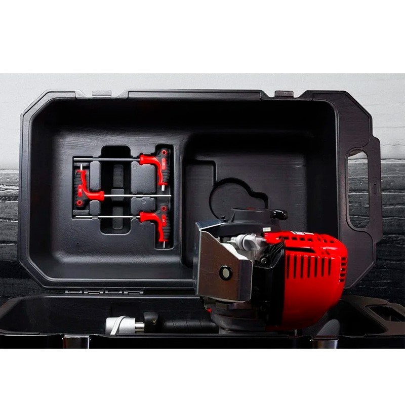 La ergonomía está resuelta con asas suspendidas por muelles que reducen la vibración y un doble gatillo con parada de seguridad que aporta control en pendiente o entre obstáculos. Nivel de vibración 9,94 m/s² y ruido superior a 90 dB con protección auditiva recomendada. Incluye maleta y kit de herramientas para mantenimiento rápido.