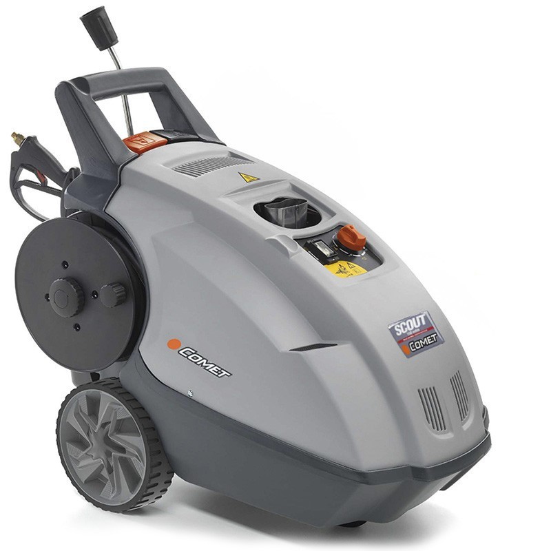 Comet Comet Der Hochdruckreiniger SCOUT 150 Extra ist mit einer elektrischen Pumpe mit drei horizontal angeordneten Axialkolben, einer Ganzmetallkonstruktion ohne Kunststoffteile im Rahmen und einem Pumpenkopf aus Messing ausgestattet.