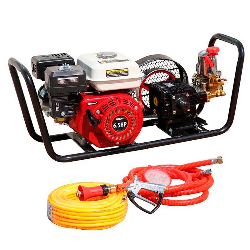 Das6,5-PS-Benzin-Sprühgerät ist für den Anbau an einen Anhänger, einen Pick-up oder eine kleine Plattform konzipiert und arbeitet völlig autonom in landwirtschaftlichen Betrieben ohne Stromanschluss oder Netzanschluss. Es ist mit einem 6,5 PS OHV 4-Takt-Motor mit einem Hubraum von 196 cm³ und einer maximalen Drehzahl von 3.600 U/min ausgestattet, der eine Hochdruck-Kolbenpumpe antreibt.