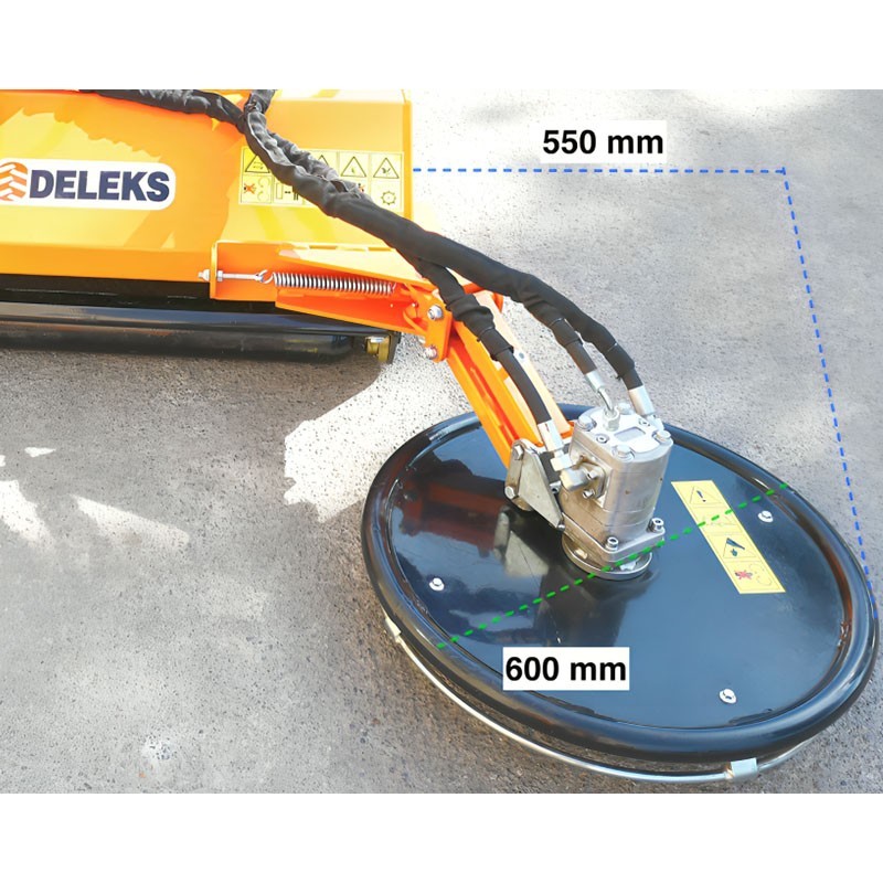 El cabezal interlíneas Deleks DISC-603 se monta en la trituradora y sirve para limpiar alrededor de las plantas y las interlíneas sin dañar la corteza. Disco interfilas, acoplable directamente al sistema hidráulico del tractor, con sistema de retroceso mecánico, 600 mm de diámetro, con estructura de protección.