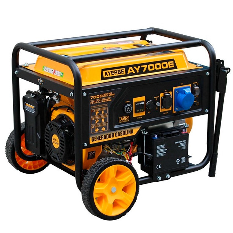 Electric generator Ayerbe 7000 E delivers 7,000 watts peak and 6,500 watts continuous at 230 volts 50 Hz with AVR electronic regulation that keeps the voltage stable at one percent. It features a 459 cc KIOTSU air-cooled engine with electric start for fast and reliable start-ups. The power factor is 0.8 and the sound level is 75 dB at seven meters for more comfortable work.
