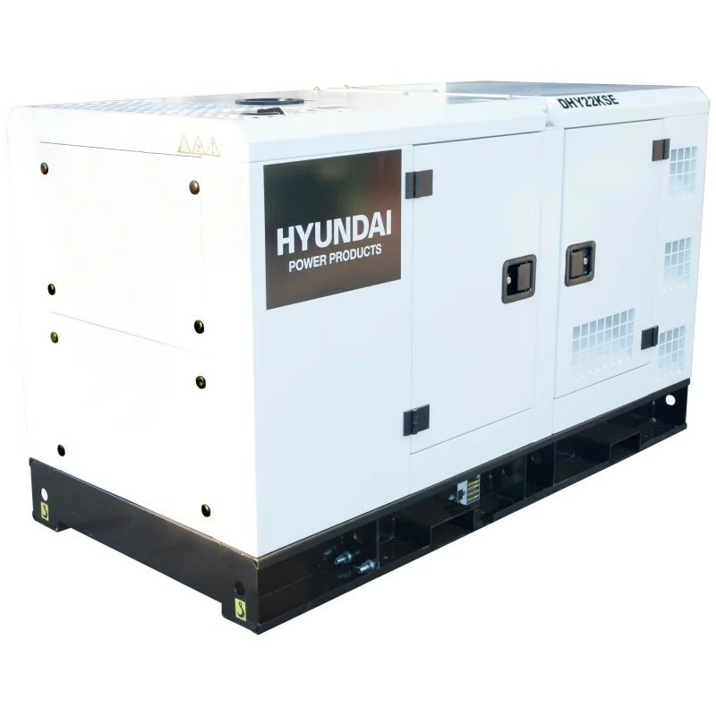 Generating set Hyundai DHY22KSE, three-phase soundproofed 22 KVA, with 4-cylinder HY490 engine. Its robust and efficient design makes it ideal for industrial uses.