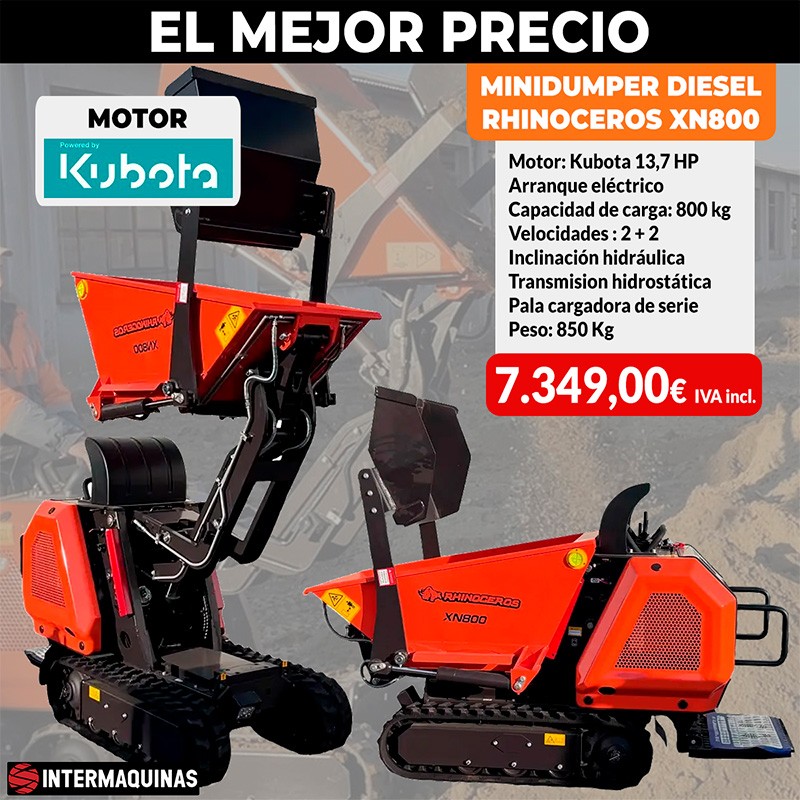 The Rhinoceros XN800 lifting minidumper with shovel features a Kubota D722 3-cylinder 13.7 hp diesel engine, renowned for its reliability, constant thrust and low consumption in continuous operation. It is key-started by electric starter and is combined with a hydrostatic transmission for smooth and precise progress, which is key when maneuvering loaded on site or between crop rows.