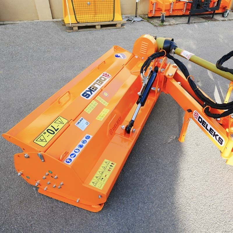 The DELEKS ALCE 160 600 kg side shredder for tractor It is designed for individuals and professionals, to cut grass, brambles, and prune up to 4 cm in diameter. This model tilts to +90 degrees and -60 degrees., for clearing the edges of ponds, for example.