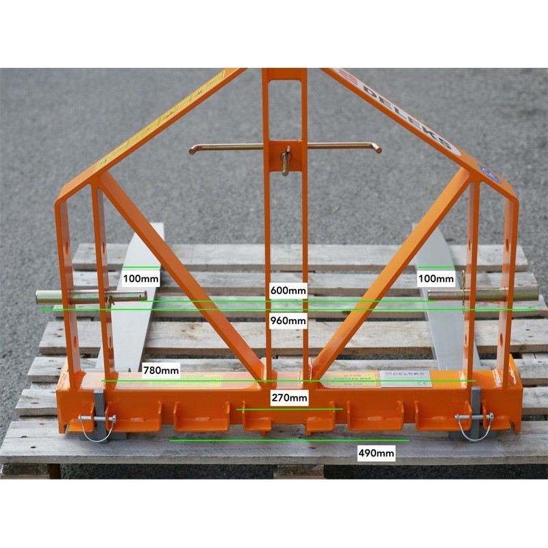 The Deleks D-700 pallet loader is an ideal accessory for tractors with a power range of 25 to 90 HP. Thanks to the forks measuring 112cm in length, with a height of 3cm and a width of 10cm, it is possible to load a pallet of up to 700kg. Additionally, each fork weighs only 24kg.