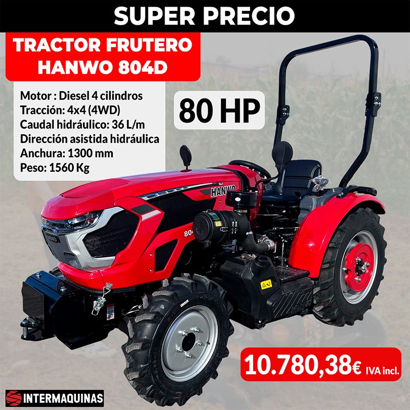 The Hanwo 804D is a compact, high performance fruit harvester designed for vineyards and orchards where real power is needed with contained dimensions. It delivers 80 HP at 2,400 rpm with a water-cooled YN Stage III engine that responds with torque from low revs and keeps fuel consumption low with a 35 L tank.