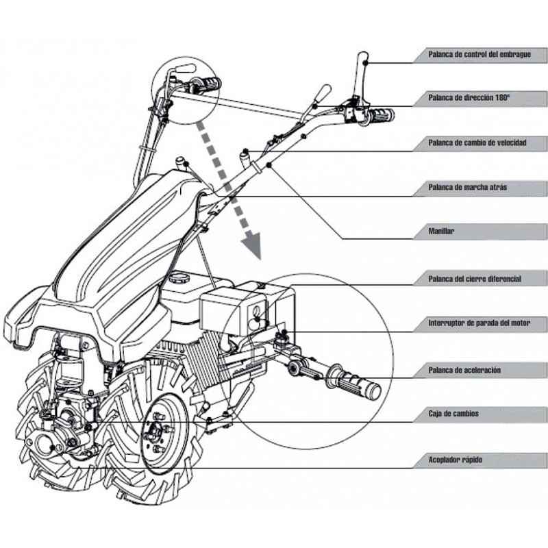 Its electric starting system makes it easy to use, ideal for intensive work in the field or garden. With a mixed transmission and 4 gears front and 3 rear, this two-wheel tractor allows it to easily adapt to different types of terrain.