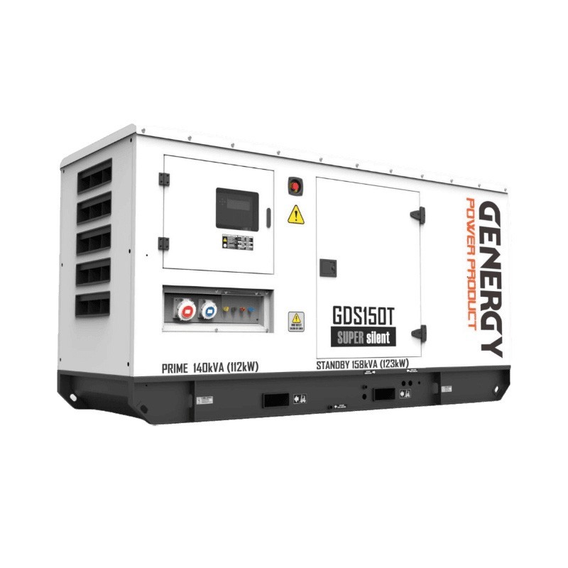 Le groupe électrogène diesel Genergy GDS150T 158 kVA a une cylindrée de 6490 cc, un poids de 1900 Kg, et sa pression sonore moyenne est de 75 dB. Il est équipé d'un système de stabilisation électronique AVR.