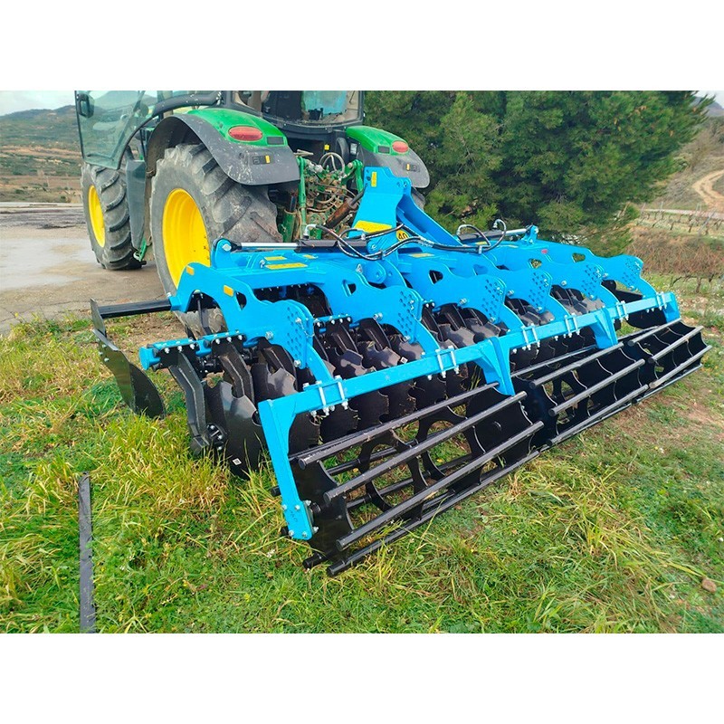 Gracias a su sistema con elastómeros, se minimiza el riesgo de daños y se protege el equipo y el tractor durante su uso. Además, las distintas configuraciones disponibles, como la opción de rastra de púas entre discos y el rodillo o rastra de púas delante del rodillo, brindan una mayor adaptabilidad a diferentes tipos de suelos y trabajos.