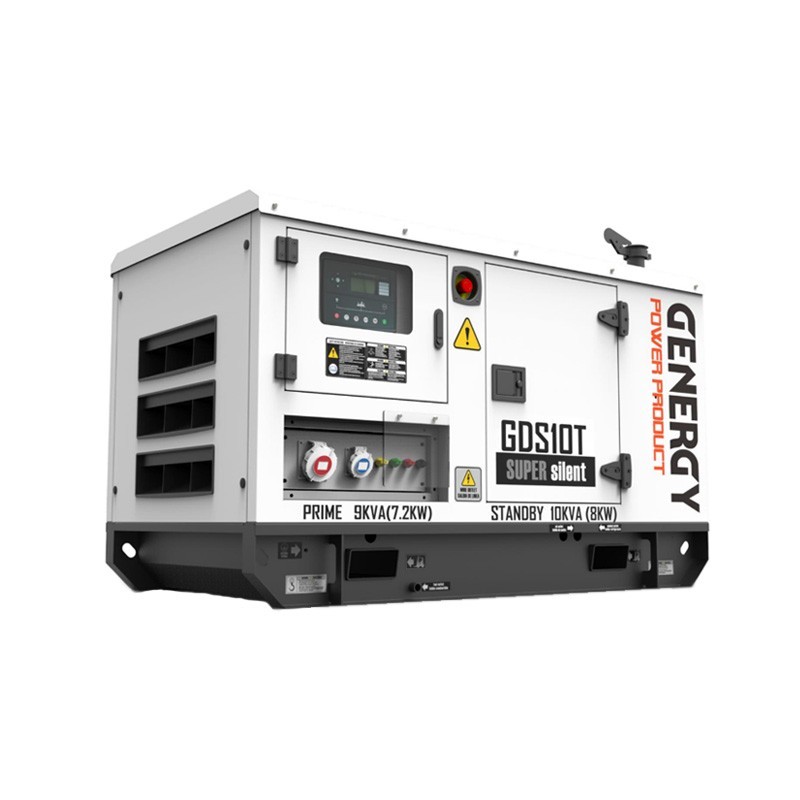 El Grupo Electrógeno Diesel Genergy GDS10T 10kVA cuenta con una potencia nominal de 9 kVA / 7.2 kW y una potencia máxima de 10 kVA / 8 kW. Su consumo de combustible es de 0.47l/h - 0.94l/h - 1.41l/h - 1.88l/h en un 25% 50% 75% 100% de su potencia respectivamente.