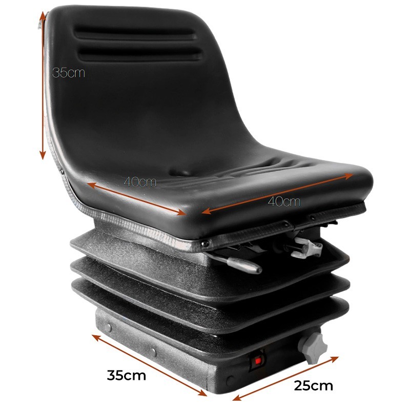 Sedile compatto per fruttiera con sospensione meccanica regolabile in base al peso per ridurre le vibrazioni. Il vassoio in PVC nero ad alta densità resiste all'uso intensivo e le guide scorrevoli facilitano la regolazione della distanza. Include una regolazione meccanica dell'altezza per adattare la postura. Dimensioni del sedile 40 cm base 35 x 25 cm e altezza 35 cm che si adattano alle piccole cabine con montaggio universale Zeppelin.