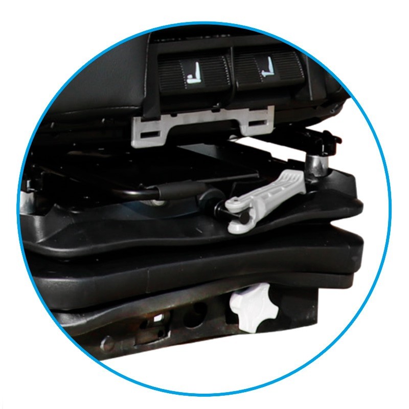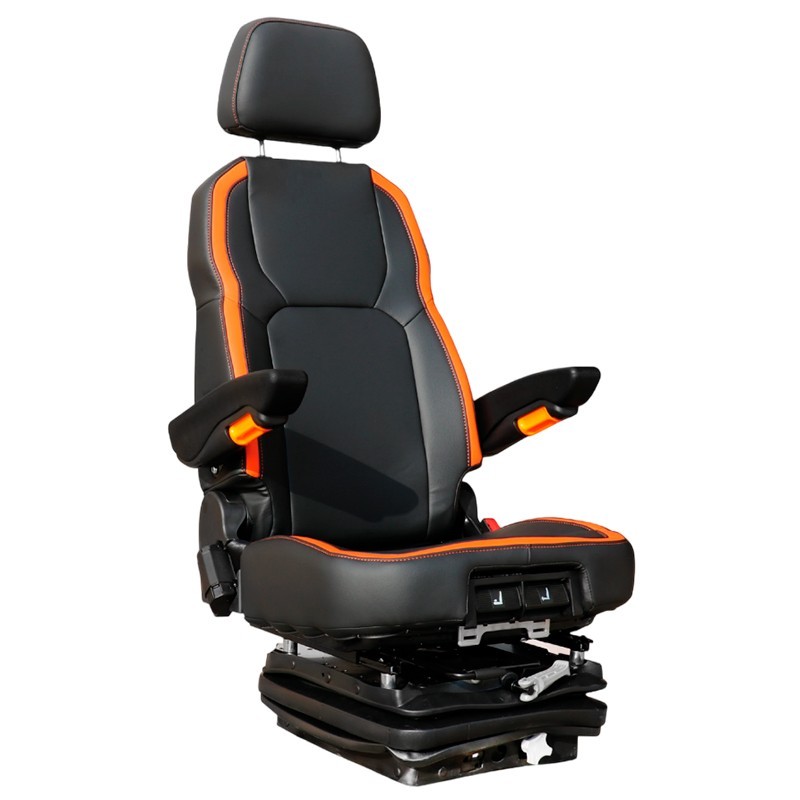 Sedile attivo con sospensione meccanica per filtrare le vibrazioni e altezza regolabile per regolare la postura dell'operatore. La base a lunga corsa mantiene la stabilità su strade irregolari. Incorpora poggiatesta e braccioli regolabili per un maggiore sostegno e viene fornito completo di cintura di sicurezza. Imbottitura robusta per un lavoro intensivo con le macchine.