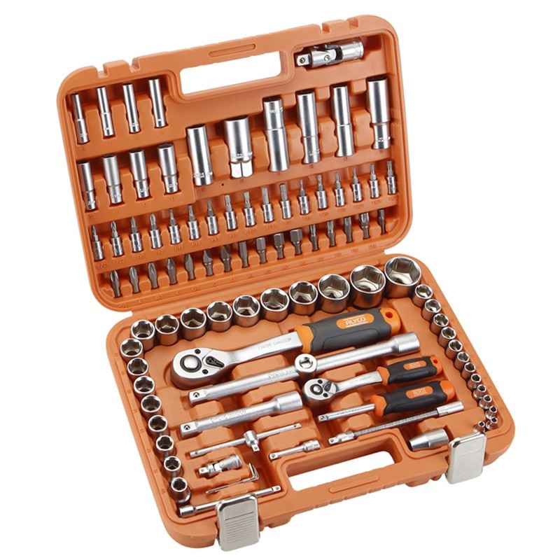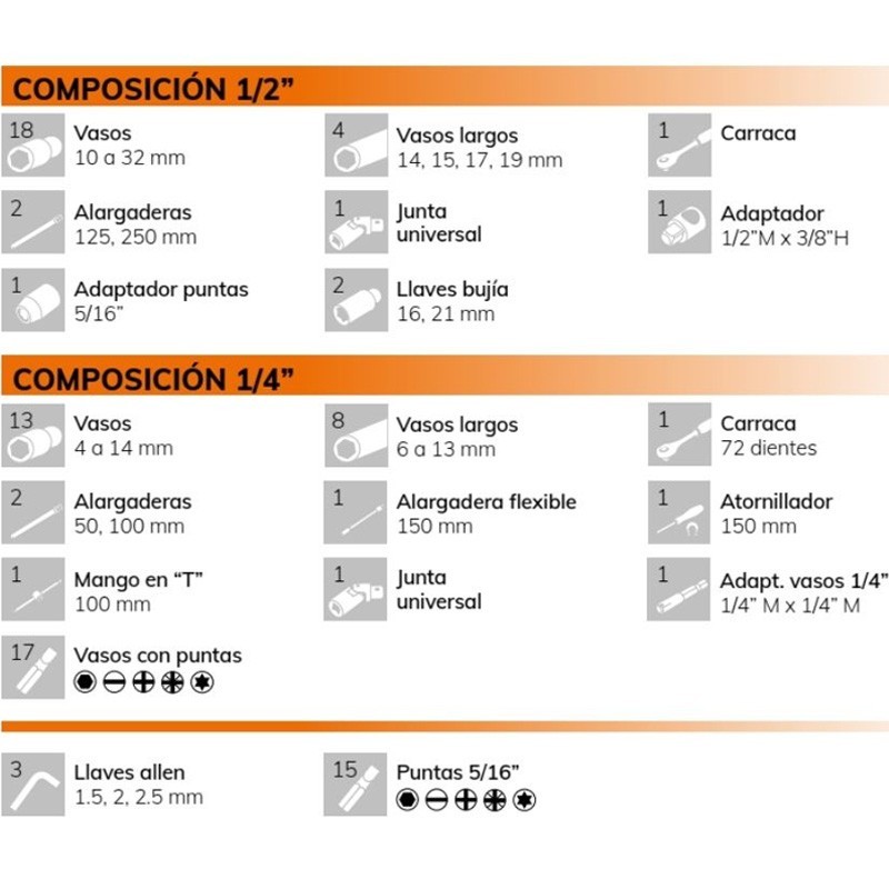 -Composizione ½": 18 bussole (da 10 a 32 mm) / 4 bussole lunghe (14, 15, 17, 19 mm) / 1 cricchetto con invertitore ed estrattore di bussole a 72 denti / 2 prolunghe (125, 250 mm) / 1 giunto universale / 1 adattatore (½"M x 3/8 "H) / 1 adattatore per bit (5/16") / 2 chiavi per candele (16, 21 mm) / 15 bit 5/16" / 3 chiavi a brugola (1.5, 2.5).5, 2, 2.5).