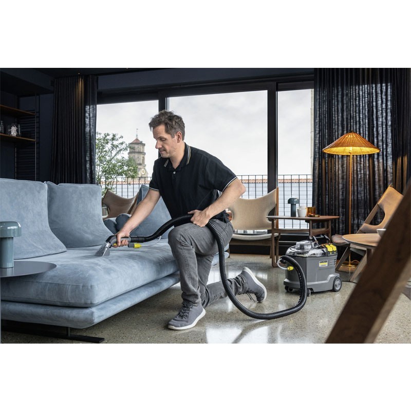 Con un cavo di collegamento di 7,5 metri e un tubo di spruzzatura/aspirazione di 2,5 metri, Karcher Puzzi 8/1 offre praticità d'uso, e il suo intelligente serbatoio 2-in-1 facilita il riempimento e lo svuotamento dell'acqua pulita e sporca.