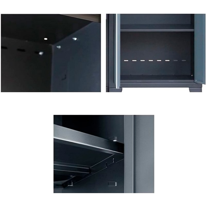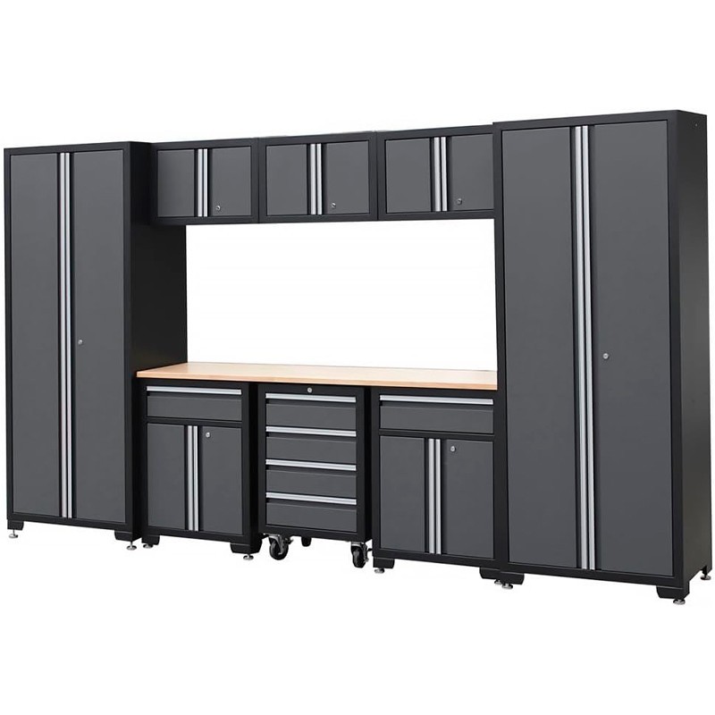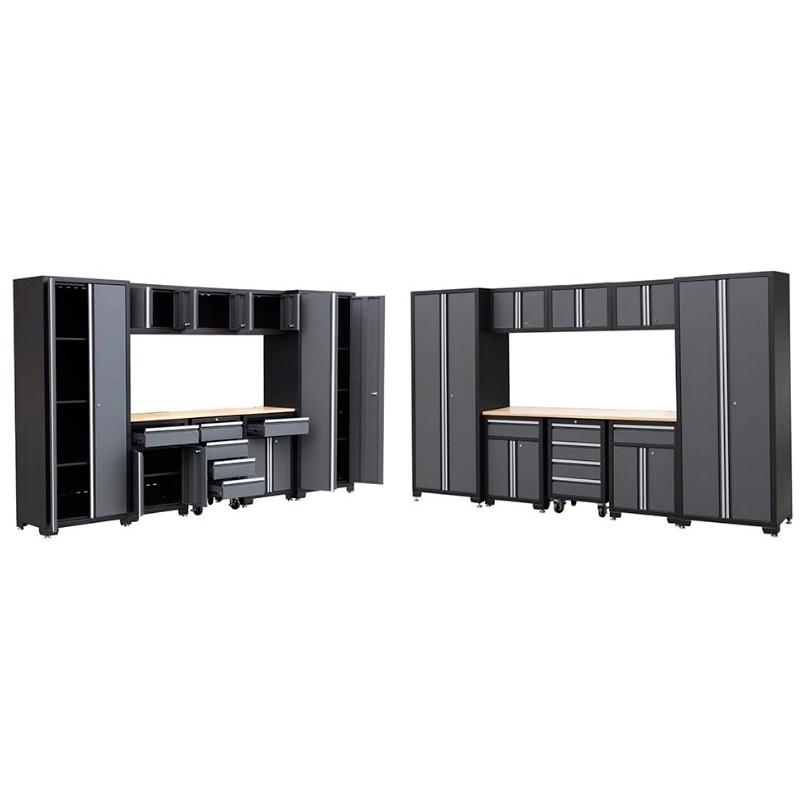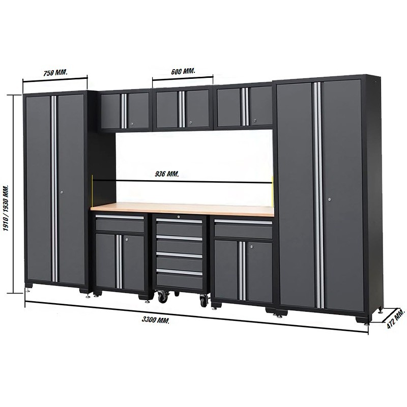 Armadio per officina modulare da 9 pezzi con banco da lavoro, progettato per riporre gli attrezzi in garage e spazi professionali. Dimensioni complessive 3300 x 472 x 1925 mm con altezza regolabile tra 1910 e 1930 mm grazie alle gambe livellanti. Struttura in acciaio calibro 24 con spessore da 0,6 a 0,7 mm e finitura verniciata a polvere antigraffio e antimacchia. Colore nero con ante grigio scuro e struttura completamente saldata per garantire la rigidità.