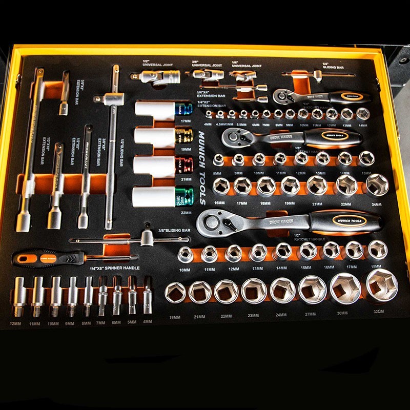 Inoltre, il vassoio della morsa rinforzato e il portautensili in schiuma EVA offrono uno spazio ordinato e un facile accesso ai suoi utensili essenziali.