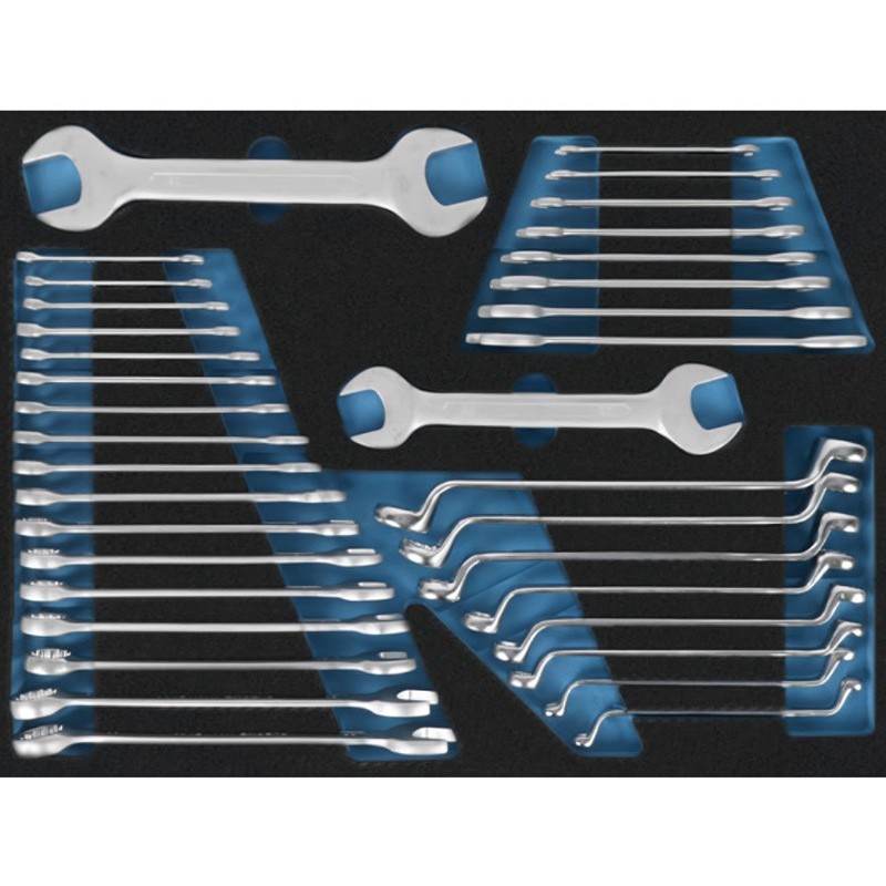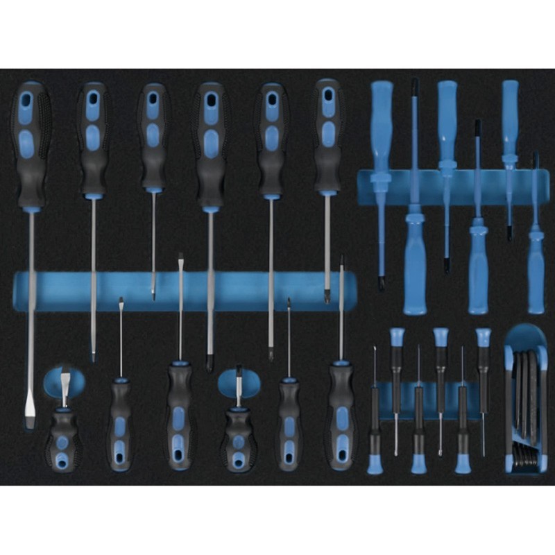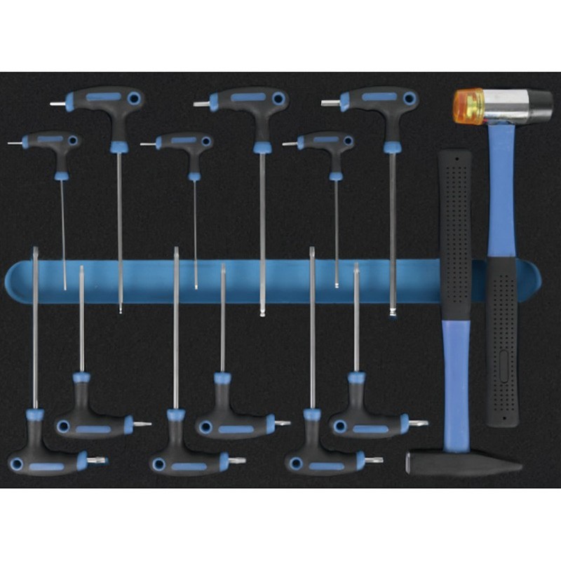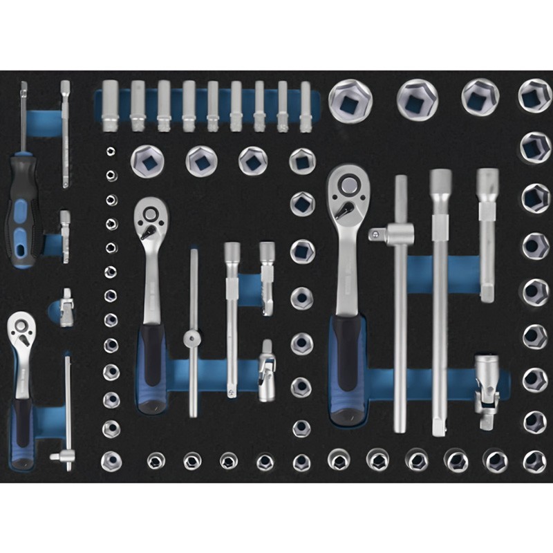 Include un set completo di vassoi in schiuma fustellati per il controllo visivo dell'inventario. Troverà cricchetti e bussole metriche, chiavi combinate e angolari, cacciaviti di vari profili, chiavi a T, pinze da taglio e di regolazione e utensili per la maschiatura.