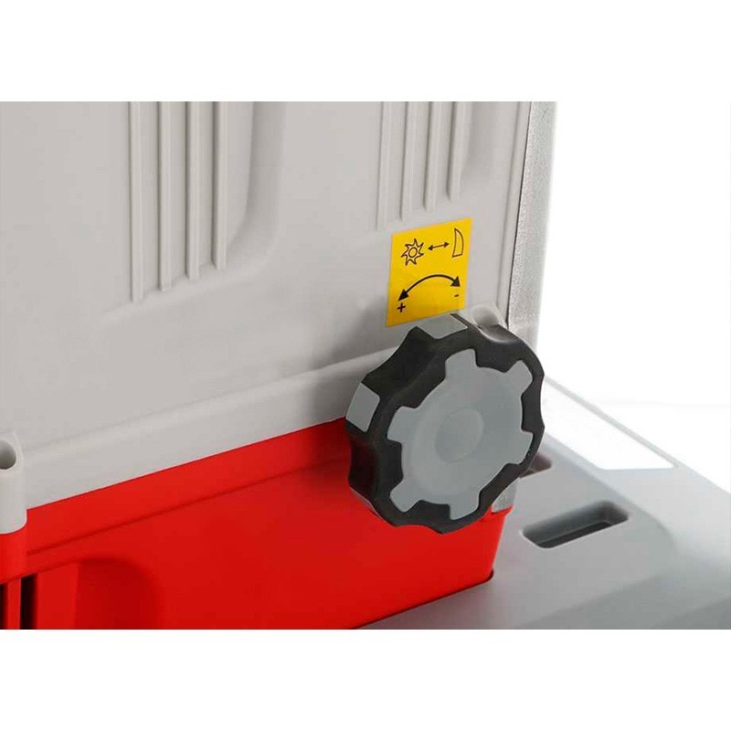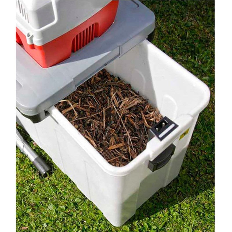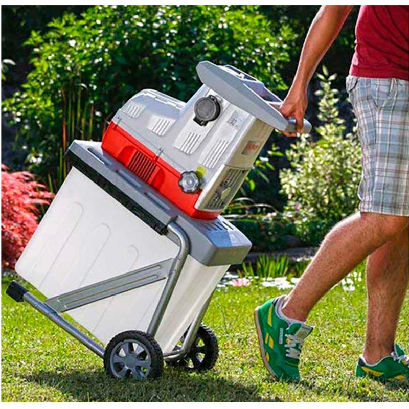 Questo modello di trituratore elettrico è dotato di ruote per il trasporto e di un serbatoio di raccolta con capacità di 60 litri. Include anche una funzione di inversione automatica e una protezione da sovraccarico.