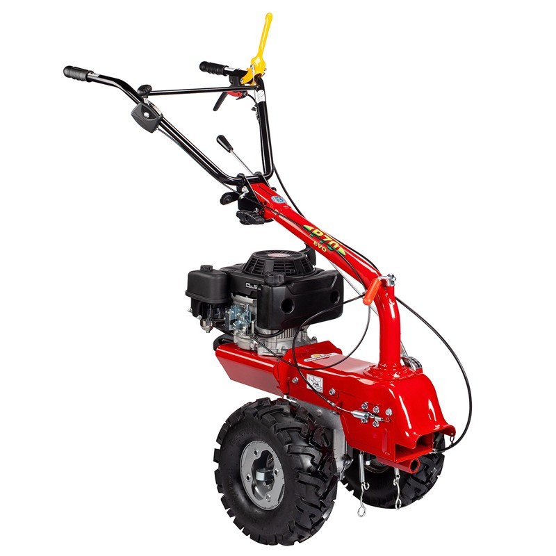 Ruote motrici con pneumatici con un profilo di trattore assicurano un'aderenza e una trazione ottimali su una varietà di terreni, il che fa sì che la Eurosystems P70 EVO è uno strumento essenziale per i lavori di giardinaggio e manutenzione.