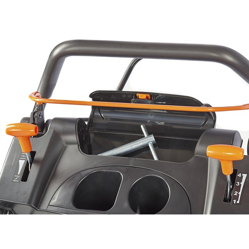 Il tosaerba ha un'ampia larghezza di taglio di 56 cm e 7 impostazioni di altezza di taglio regolabili da 25 a 75 mm. Inoltre, include una paletta da 70 L che le consente una totale indipendenza durante il lavoro, senza dover fare continue soste, e ha un indicatore di riempimento della paletta. Ha anche un'impugnatura ergonomica e la funzione 4 in 1 (taglio-riciclo-riciclo-uscita laterale)