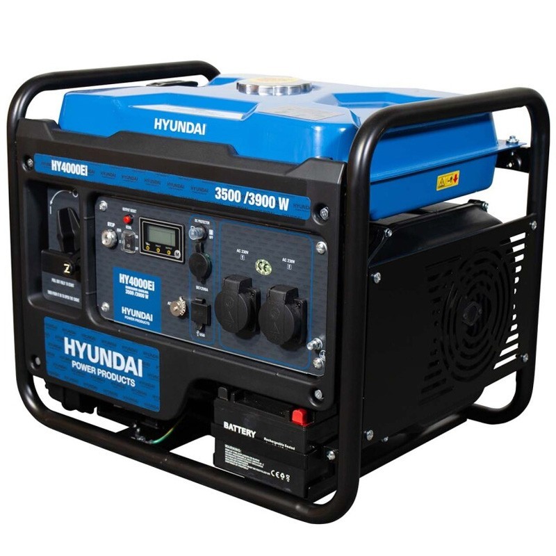 Il generatore inverter a benzina Hyundai HY4000Ei offre una potenza nominale di 3,5 kW e una potenza massima di 3,9 kW a una tensione di 230V. Ha un display digitale per un facile monitoraggio e una capacità del serbatoio di 15 litri, che gli consente di funzionare per circa 12 ore al 50% del carico.