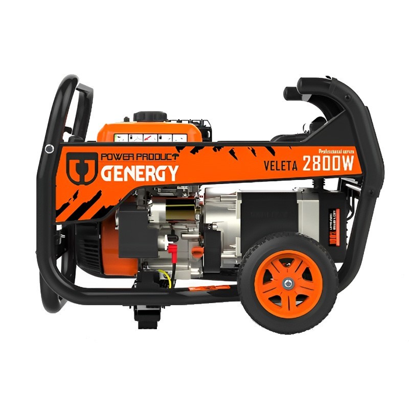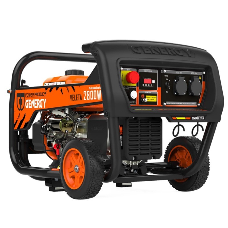 Il Generatore elettrico a benzina Genergy Veleta 2800W ha una tensione di 240 V, una frequenza di 50 Hz, una potenza nominale di 2500 W e una potenza massima di 2800 W, ed è dotato di una bobina di rame.