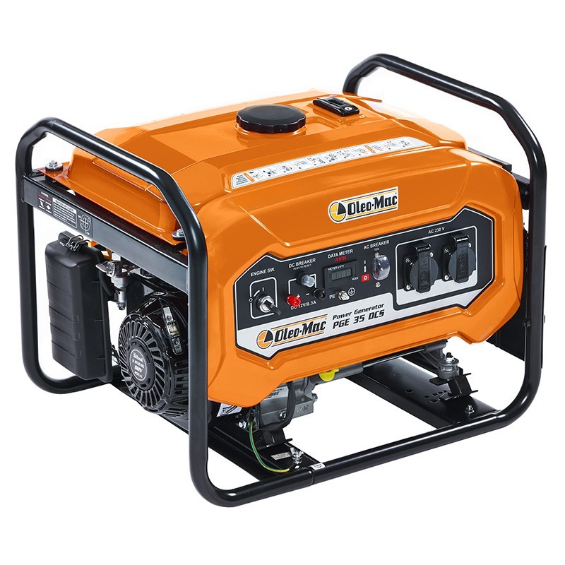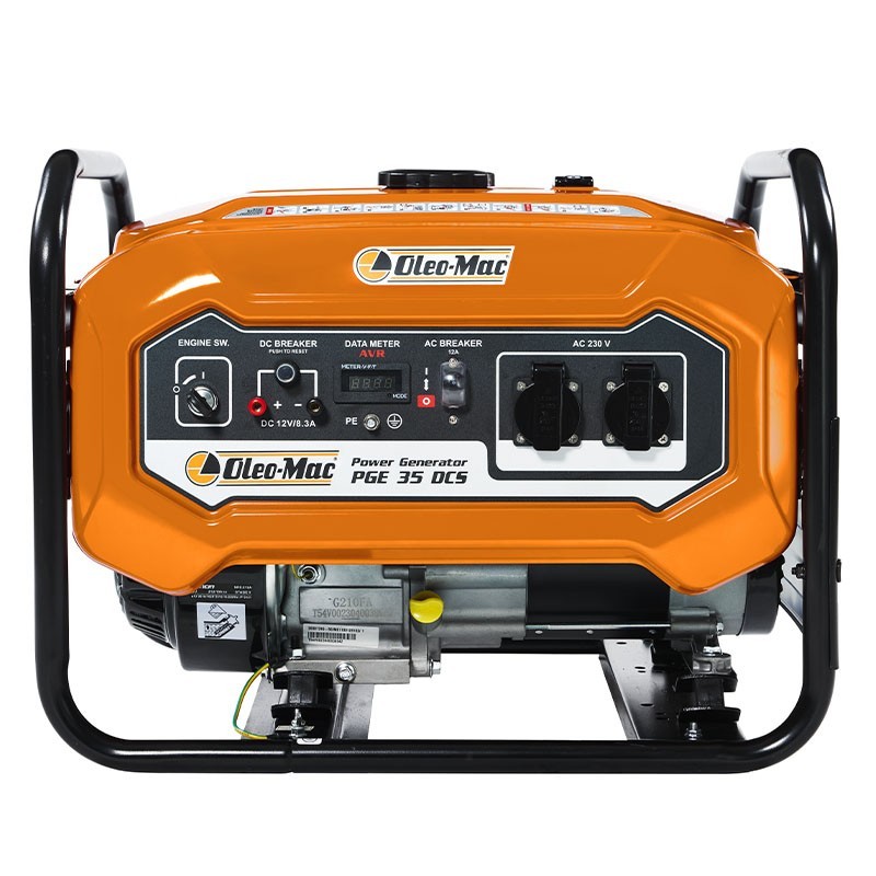 Il generatore elettrico a benzina Oleo Mac PGE 35 DCS ha un serbatoio da 15 litri e un motore da 212 cc che genera una potenza di 2,8 kW. Offre opzioni di tensione 110/120/220/230V e una qualità di alimentazione AC G1 THD.