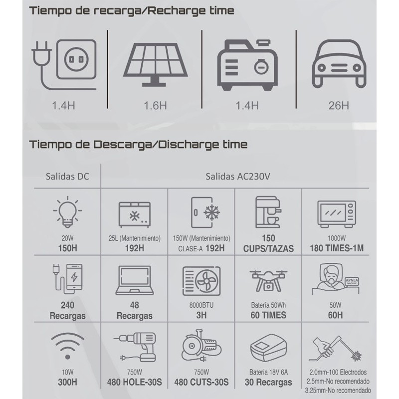 La ricarica è rapida ed efficiente, con un tempo di ricarica completa di 1,4 ore tramite corrente alternata e 1,6 ore tramite pannelli solari. La protezione digitale da sovraccarico e la sicurezza dei componenti, come la protezione IP67 sulle uscite, garantiscono un funzionamento sicuro e affidabile.