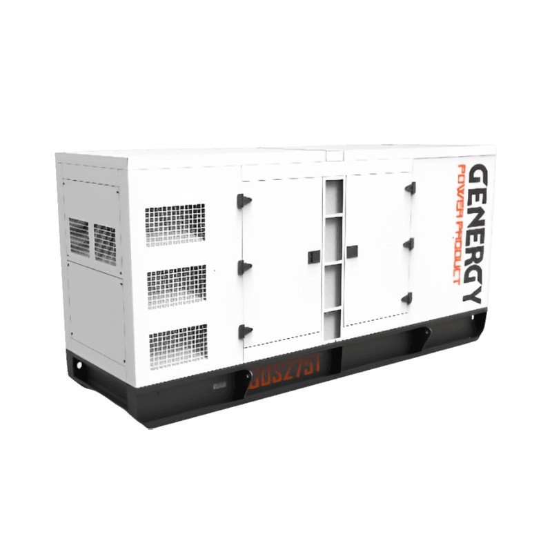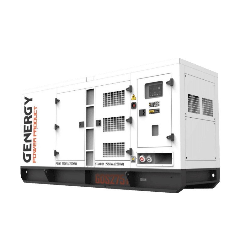 Il gruppo elettrogeno diesel Genergy GDS275T 275 kVA ha una pressione sonora media di 75 dB, una potenza nominale di 250 kVA / 200 kW, una potenza massima di 275 kVA / 220 kW, e una tensione di 400 V con una frequenza di 50 Hz.