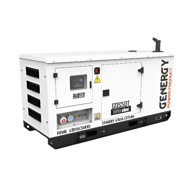 Il gruppo elettrogeno diesel Genergy GDS50T 47kVA ha una frequenza di 50 Hz, una potenza nominale di 43 kVA / 34 kW, una potenza massima di 47 kVA / 37 kW, un peso di 1350 kg e dimensioni di 2400x1050x1350 mm. È dotato di una bobina di rame.