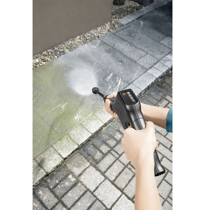 Ulteriori caratteristiche, come l'impugnatura estensibile e la base di supporto, rendono comodo il trasporto e lo stoccaggio. Il sistema Quick Connect di Karcher semplifica il collegamento del tubo flessibile ad alta pressione.