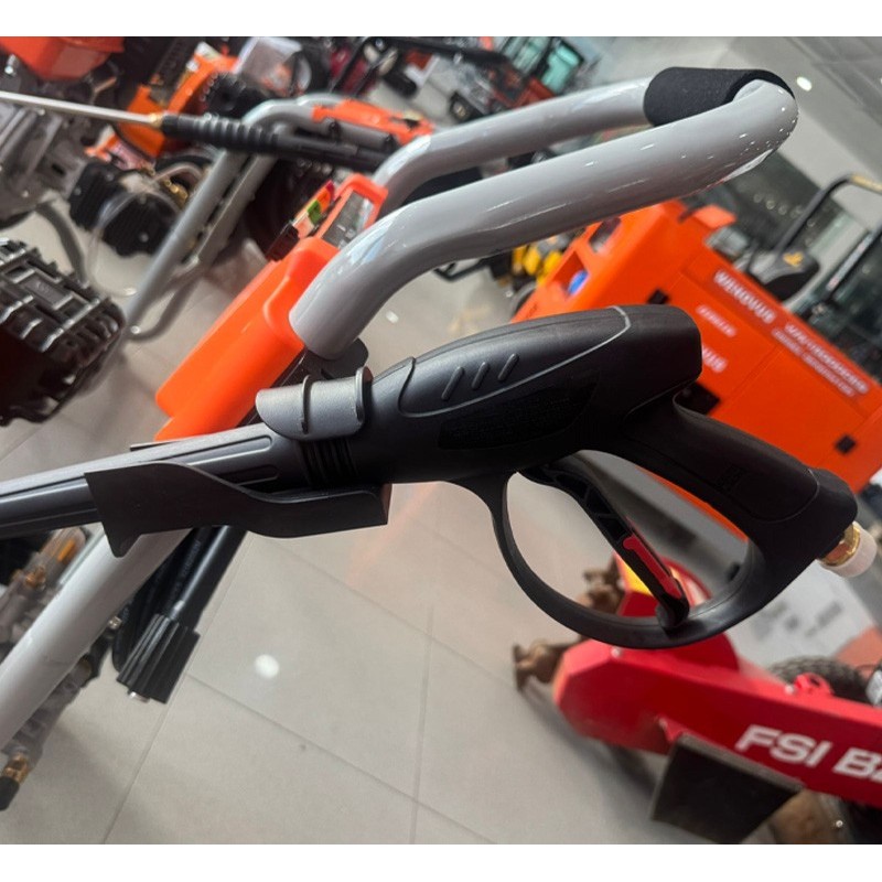 Il suo telaio rivestito offre maggiore resistenza e durata, mentre il sistema di stoccaggio integrato consente di tenere gli accessori sempre a portata di mano. Dispone inoltre di un serbatoio di sapone a bordo e di un tubo flessibile da 9,2 metri con connettore M22, che ne facilita l'uso anche in aree difficili da raggiungere.