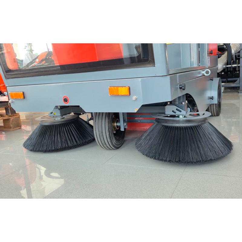 Ofrece un ancho de trabajo de 1500 mm y un sistema de cepillado compuesto por 1 cepillo principal y 2 cepillos laterales para bordes, ideal para recoger suciedad en esquinas y zonas de difícil acceso. El cepillo principal tiene 700 mm de longitud y mueve con motor de 800 W, mientras que los laterales son de 500 mm de diámetro con motor de 500 W, logrando una eficiencia de trabajo de hasta 8000 m2 h.