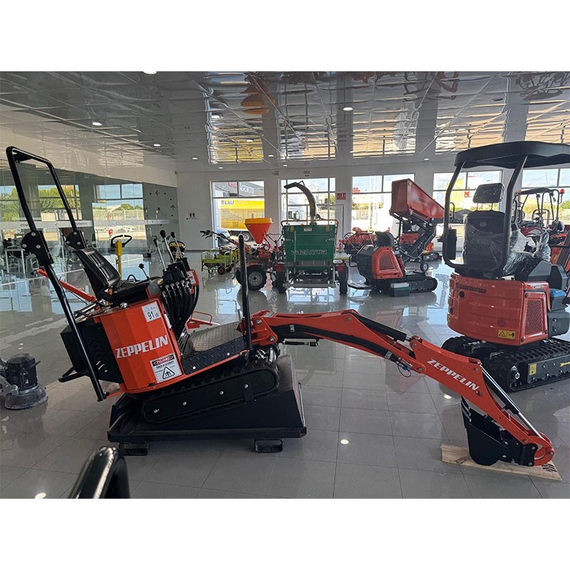 Miniescavatore idraulico Zeppelin Mini Pincher con motore Briggs and Stratton benzina 420 cc 4 tempi OHV Stage V e 13,5 CV. Telaio compatto su cingoli con sovrastruttura girevole a 360 gradi e peso di 710 kg per una manovrabilità stabile in cantiere. Dimensioni compatte di 2000 mm di altezza per 950 mm di larghezza e 1900 mm di lunghezza.