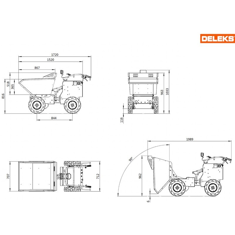 Il Minidumper Deleks XE-4WD è la soluzione perfetta per i lavori di trasporto in spazi ristretti e impegnativi. Grazie alle quattro ruote motrici e al design compatto di soli 72 cm di larghezza, può passare attraverso porte standard e muoversi con facilità su terreni difficili.