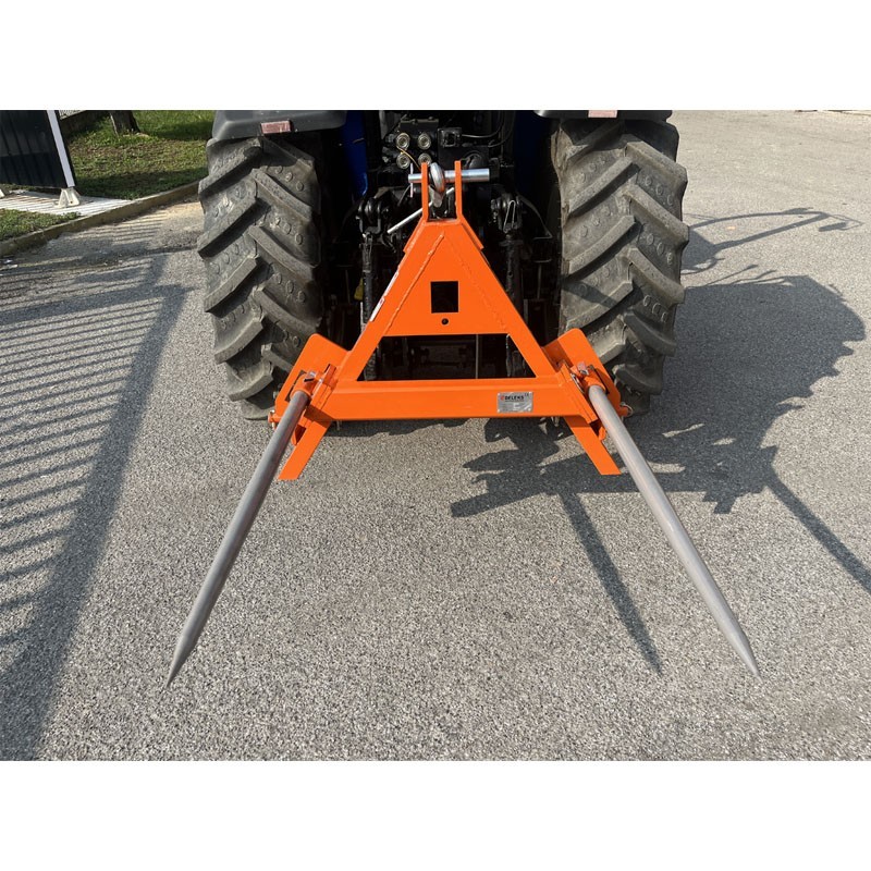 Il caricatore di balle DELEKS DK-6 con forche per trattore è progettato in acciaio rinforzato per facilitare l'inserimento e il sollevamento dei rotoli di fieno. Ha un gancio a 3 punti di categoria 1 - 2 e un attacco rapido triangolare