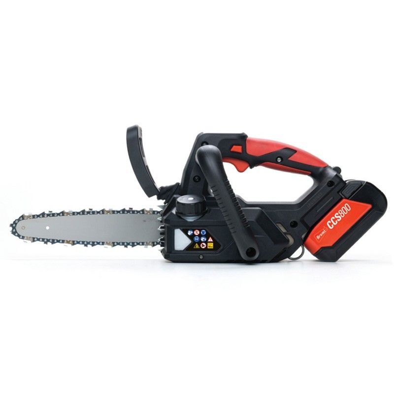 La motosega da potatura Brumi CCS800 ha un motore brushless da 600 W alimentato da 21 volt da una batteria da 5 amp/ora. La lunghezza della barra è di 20 centimetri.