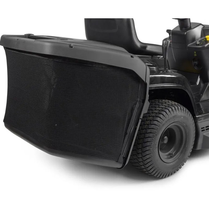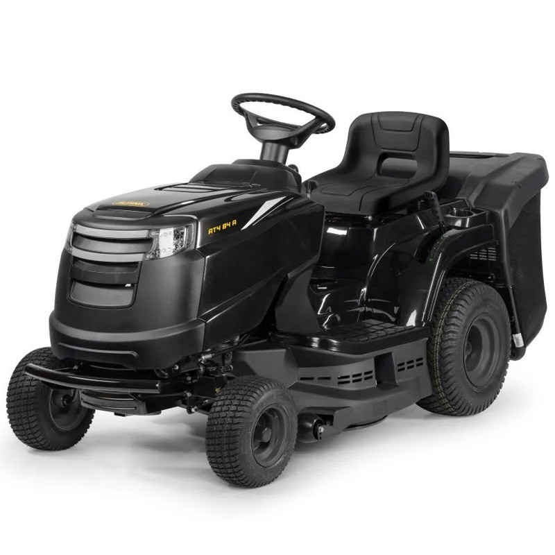 Il trattore tosaerba Alpina L'AT4 84 A ha una larghezza di taglio di 84 cm e un collettore da 200 litri, con la possibilità di includere un kit mulching opzionale.