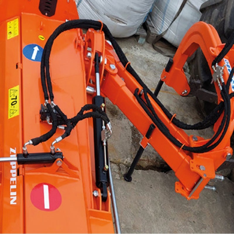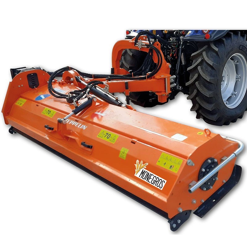 Trinciatrice Zeppelin Monegros super rinforzata con accumulatore di azoto che ammorbidisce l'abbassamento del gruppo e agisce come anti-shock. Il risultato è un lavoro più fine, meno urti e una maggiore durata del braccio, dei cilindri e del telaio.