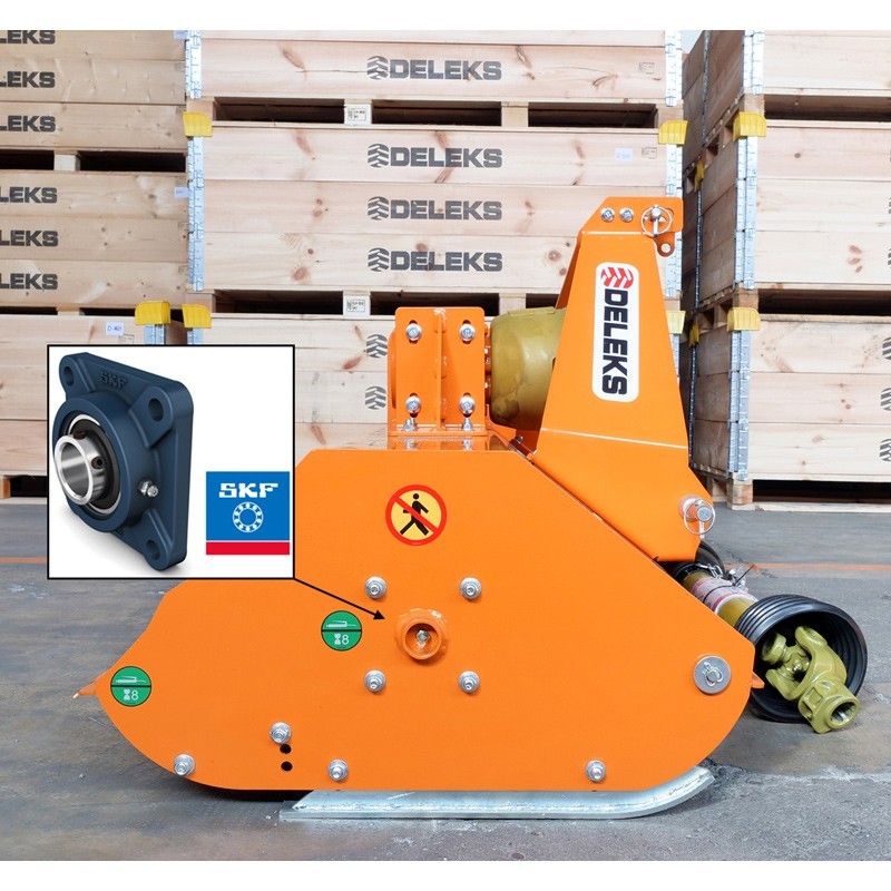 Il modello Deleks LINCE-120 ha martelli forgiati per erba e piccoli rovi. Ha un'altezza di taglio regolabile grazie al rullo posteriore e ai pattini regolabili. Ha anche un collegamento universale a 3 punti CAT 1.