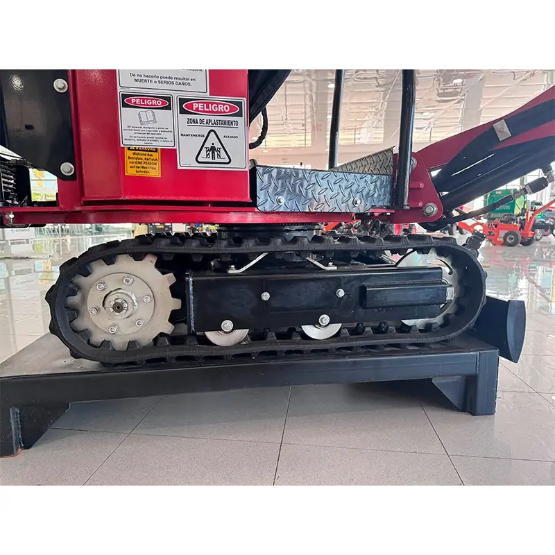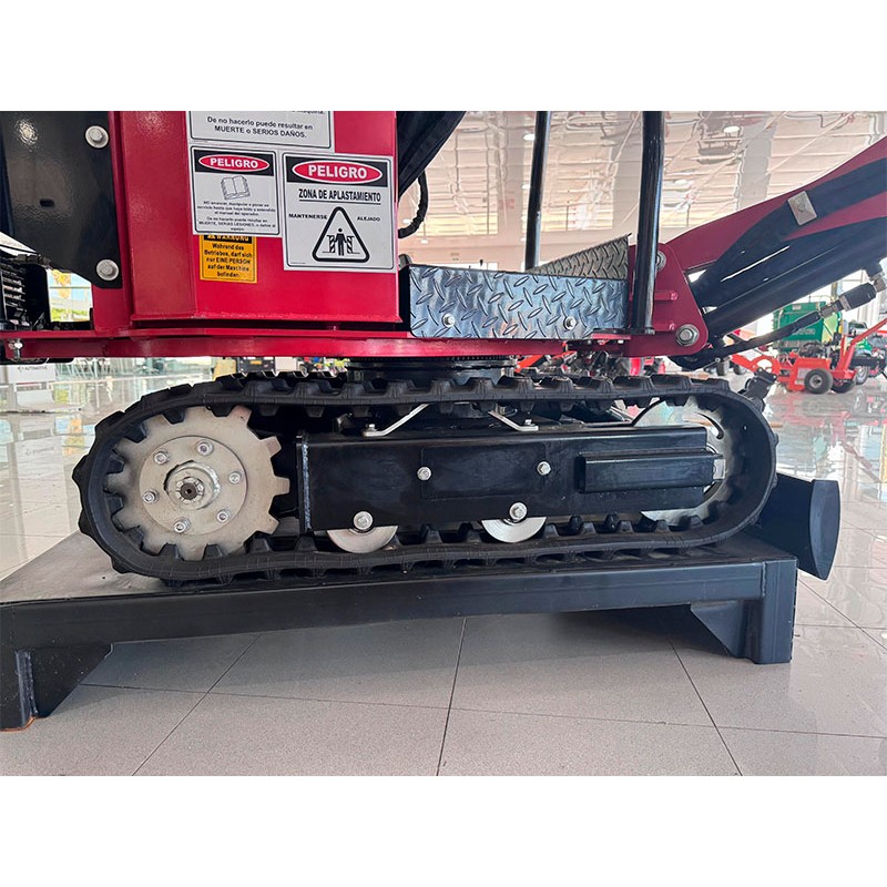 Su tamaño es su gran ventaja. Con un ancho de unos 82,5 cm entra por pasos estrechos, puertas y pasillos de obra. Pesa 650 kg, se transporta fácil en remolque y la mayor altura de base aporta estabilidad. Las orugas de goma cuidan pavimentos y césped y el techo protege al operador.