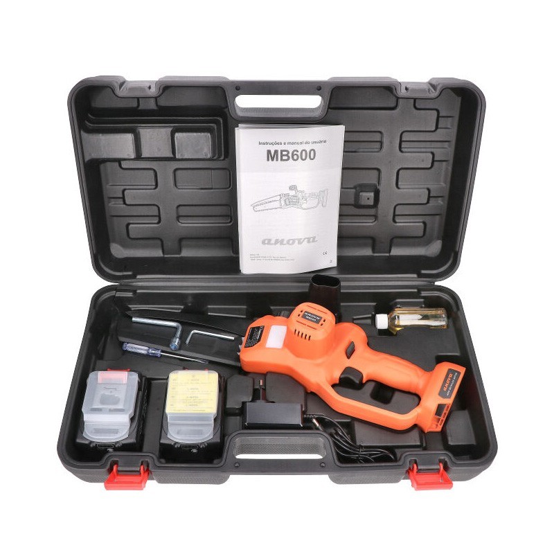 La Mini Motosierra a Batería Anova MB600 cuenta con una longitud de corte de 20 cm - 8". También incluye una cadena de 1/4 .043″ 47E, un cargador de 1,5Ah, 2 baterías de 4Ah y un maletín de transporte.