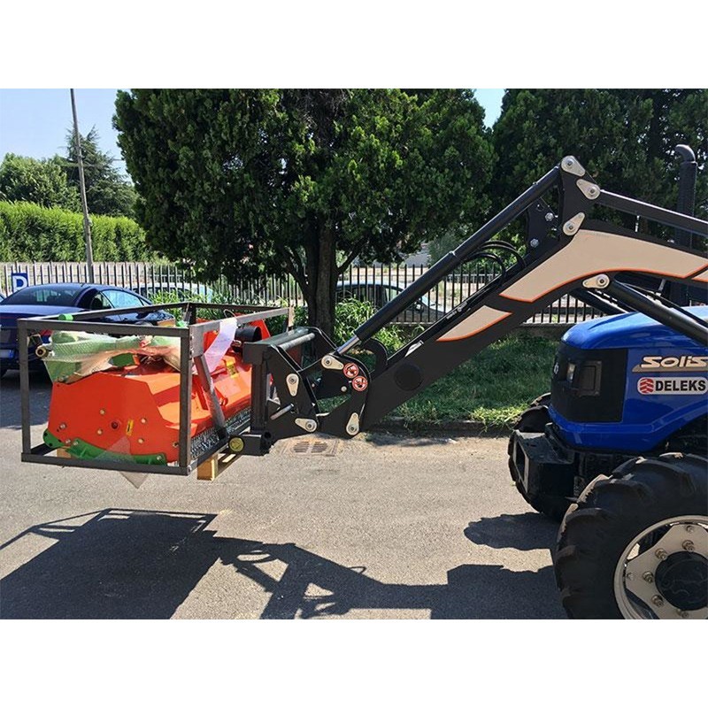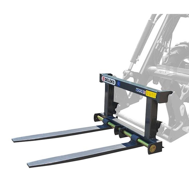 El cargador de palets de Deleks D-700-E son un complemento ideal para tractores con una potencia de entre 25 y 90 HP. Gracias a las horquillas de 112cm de longitud, con una altura de 3cm y un ancho de 10cm; haciendo posible cargar un palet de hasta 700kg. Además de tener un peso de tan solo 24kg cada horquilla.