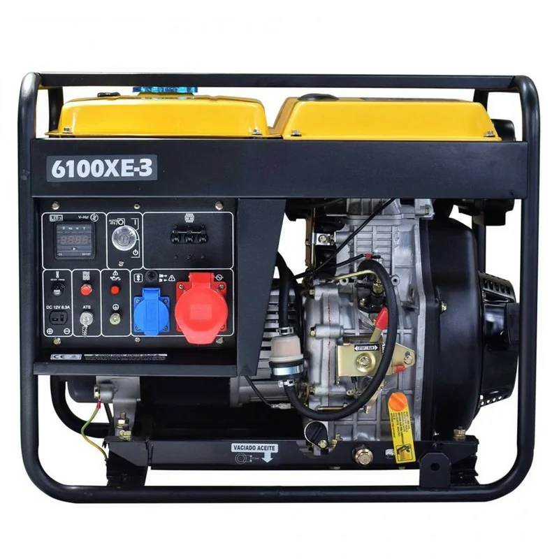 O gerador elétrico trifásico Kompak K6100XE-3 destaca-se pelo seu motor diesel a 4 tempos, arrefecido a ar, com injeção direta, fornecendo uma potência nominal de 6,25 kVA e uma potência máxima de 6,60 kVA a uma frequência de 50 Hz e uma tensão de 400 V.