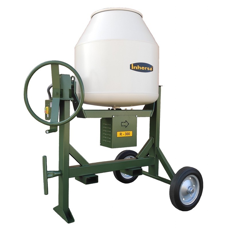 Inhersa A betoneira eléctrica R-300 está disponível em dois modelos: um com motor elétrico monofásico de 1 CV a 230 V 50 Hz e outro com motor elétrico trifásico de 1 CV a 400 V 50 Hz. Ambos os modelos têm uma capacidade de depósito de 290 litros e uma capacidade de mistura de 220 litros, o que facilita o trabalho em projectos de construção.