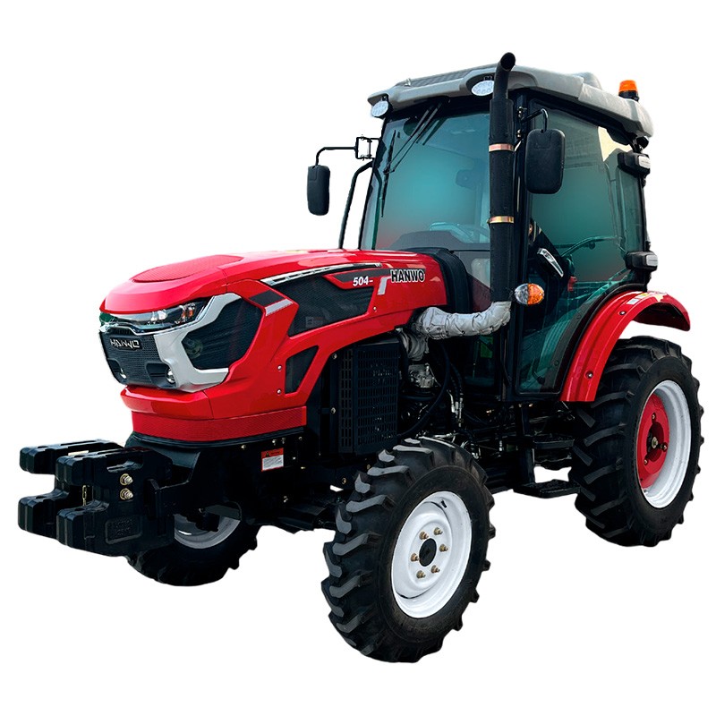 Do ponto de vista mecânico, o Trator Hanwo 504 é equipado com o motor LAIDONG Stage II de 4 cilindros com bomba de injeção, com uma potência máxima de 36,8 kW e 55 cv às 2400 rpm. O depósito de combustível é de 50 litros, uma capacidade prática para um dia inteiro de condução sem necessidade de reabastecimento constante. A tração às quatro rodas 4WD melhora a aderência em terrenos soltos e inclinados e permite um trabalho mais seguro na quinta e no campo.